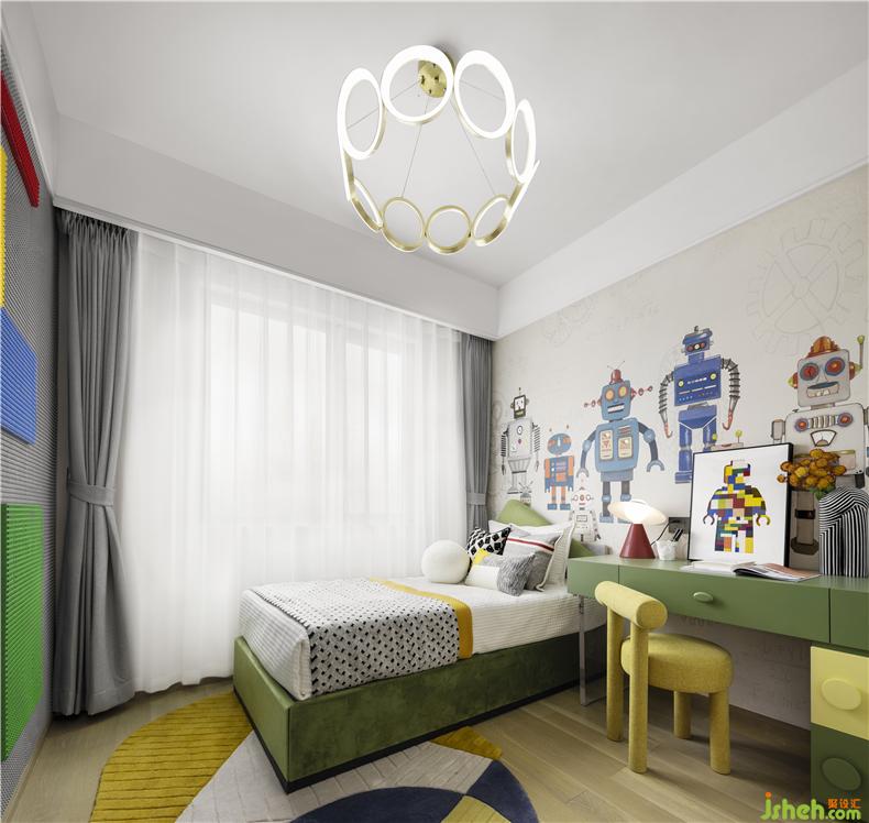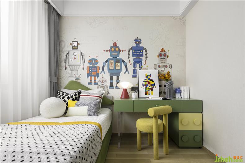 樂高積木一直是兒童喜愛的玩具,兒童房從兒童的喜好為切入點,運用黃色和綠色為主色調打造一個小小的樂高王國,樂高積木形態(tài)的書桌盡顯童趣,樂高墻又增添了幾分親子互動的快樂。