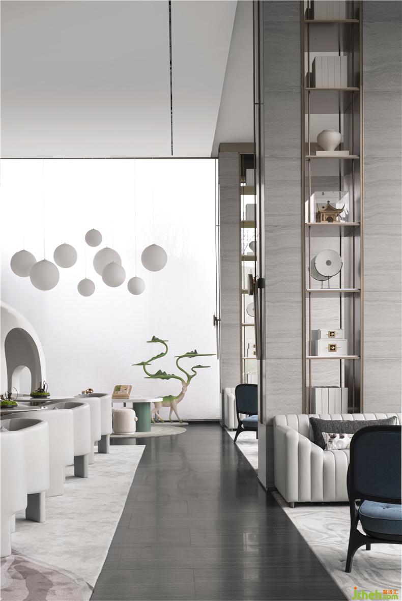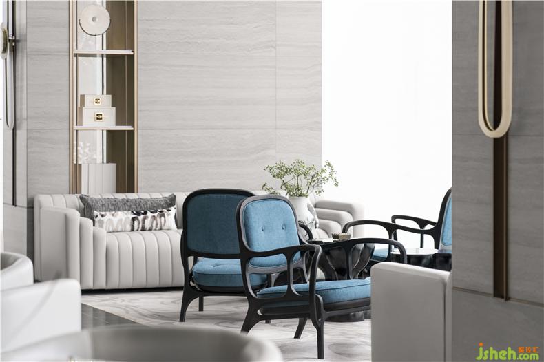 在洽談區(qū),將歸宿感推向極致。全力建造一個(gè)于自然間醉心風(fēng)月、休憩心靈的歸隱之處,倡導(dǎo)平和優(yōu)雅、蘊(yùn)含慰藉的詩(shī)意生活。色調(diào)延續(xù)灰白色調(diào)為主之外,局部點(diǎn)綴的孔雀藍(lán)色和晚霞色,讓用戶重拾夕陽(yáng)下靜止的樹(shù)枝、淡雅的花朵和呼吸的葉脈的感受;材質(zhì)延續(xù)以木質(zhì)、大理石和布藝為主,這是中華兒女居家空間中最為熟悉的材質(zhì),連結(jié)用戶歸宿的情感共鳴。