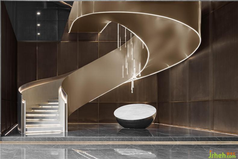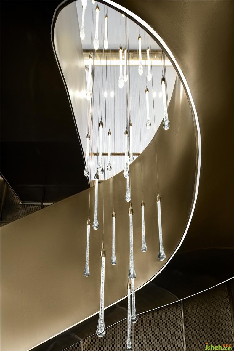 線在物理世界是以邊界的形式存在的,而感官世界里線是一種尺度的認(rèn)知,它的意義不來(lái)自于自身,而來(lái)自如何被形容。沿著墻、循著光,按著動(dòng)線進(jìn)入樓梯拾級(jí)而上金色綢緞自然回旋的樓梯,室內(nèi)設(shè)計(jì)師可靜觀可動(dòng)賞,錯(cuò)落式的燈光裝置如雨幕降落,底部鏡面裝置反射燈光出如夢(mèng)如幻的,俯瞰光影舞動(dòng)。
