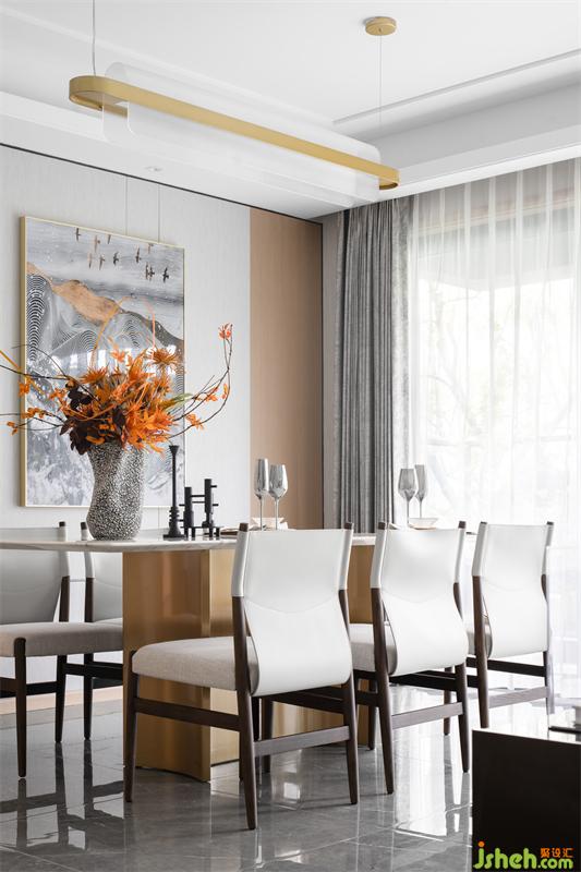 餐廳一直是中國家庭的居心地。素色的餐桌椅搭配造型別致的金屬吊燈,樣板房設(shè)計(jì)為這個(gè)暢談相聚的區(qū)域加入現(xiàn)代的美感。