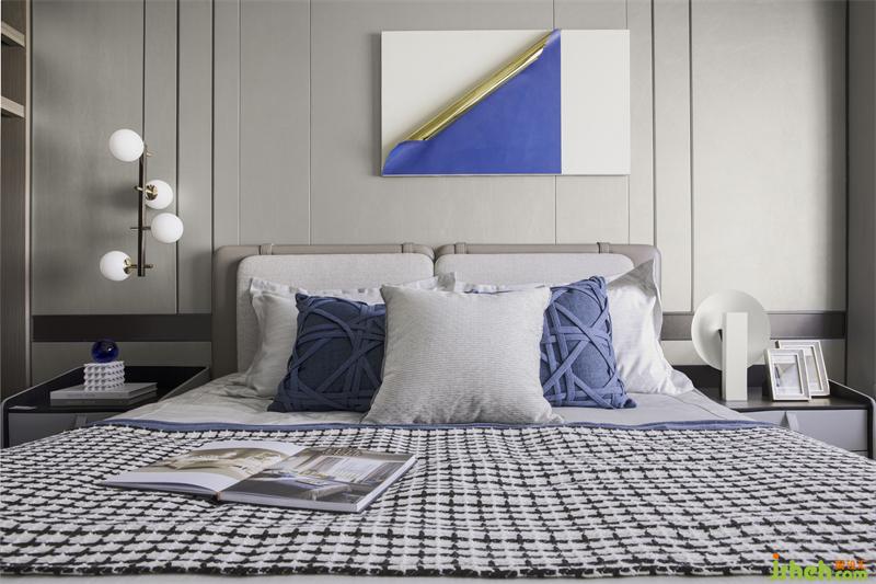 淺色系的主臥空間穿插不同層次藍(lán)色調(diào),樣板房設(shè)計(jì)營造淡雅的氛圍。