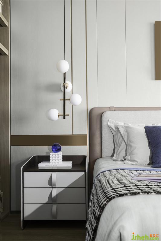 燈材也凸顯出精致感,玻璃包裹著金屬的光澤,樣板房設(shè)計(jì)使得整體空間典雅而帶著一絲微瀾的蕩漾。