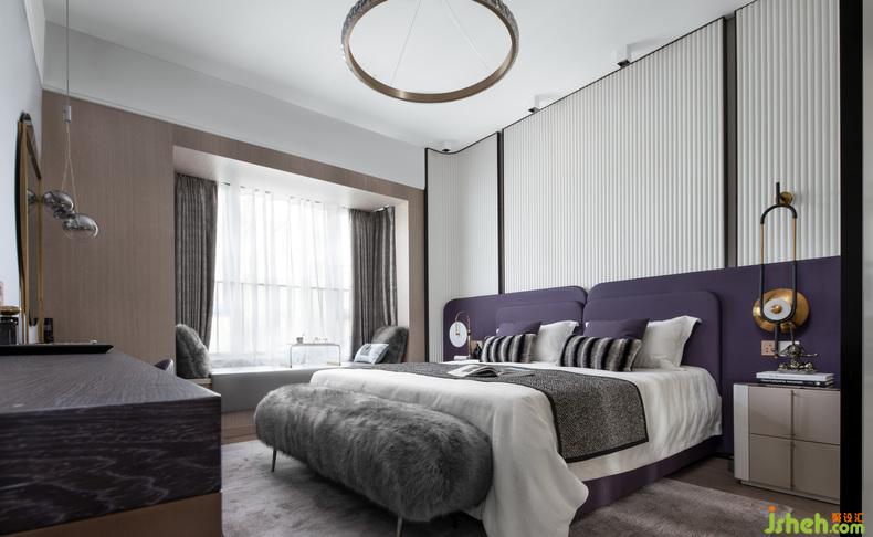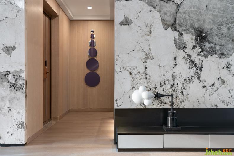 客廳與餐廳的界限被模糊,令家居生活的中心區(qū)域更加集中。樣板房設(shè)計(jì)木質(zhì)與大理石是純粹理性的代表,在之中融入神秘的圣羅蘭紫,是居住者在理性思維下的感性表達(dá)。
