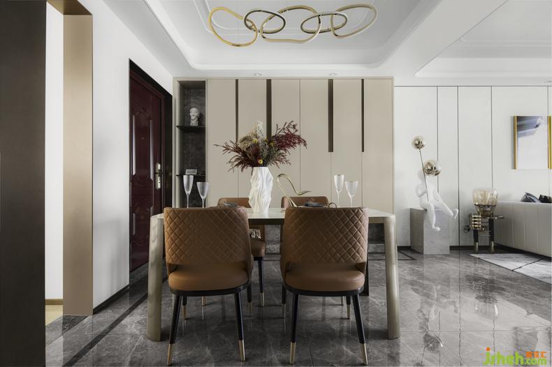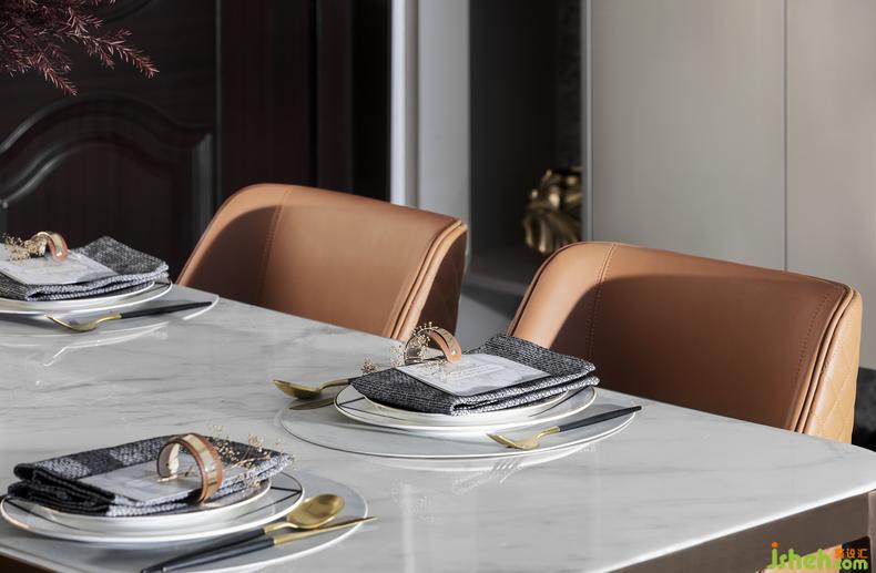 大理石餐桌、棕色皮質(zhì)餐椅與客廳配色遙相呼應,強化了室內(nèi)空間的統(tǒng)一感與精致感。