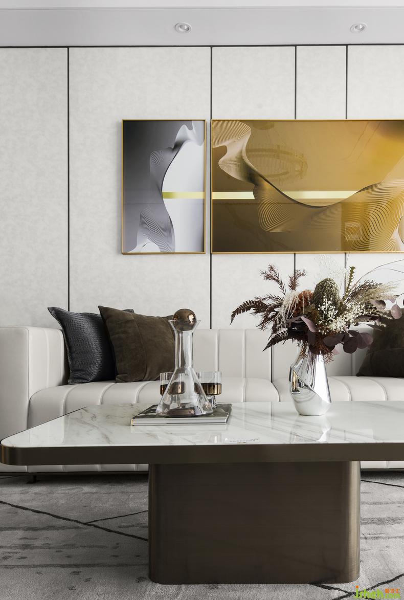 素雅輕奢的皮質(zhì)沙發(fā)、光澤柔和的大理石臺面、現(xiàn)代風格濃厚的掛畫,串聯(lián)描摹出現(xiàn)代精致客廳空間的準確畫像。