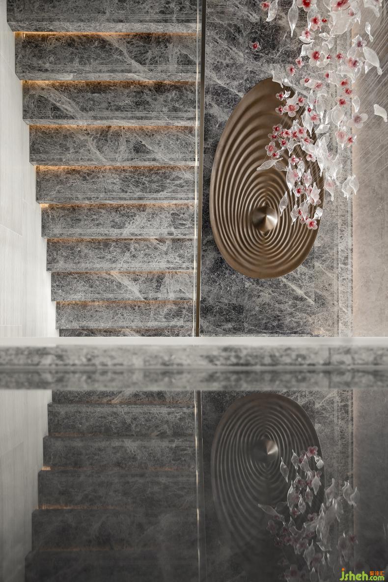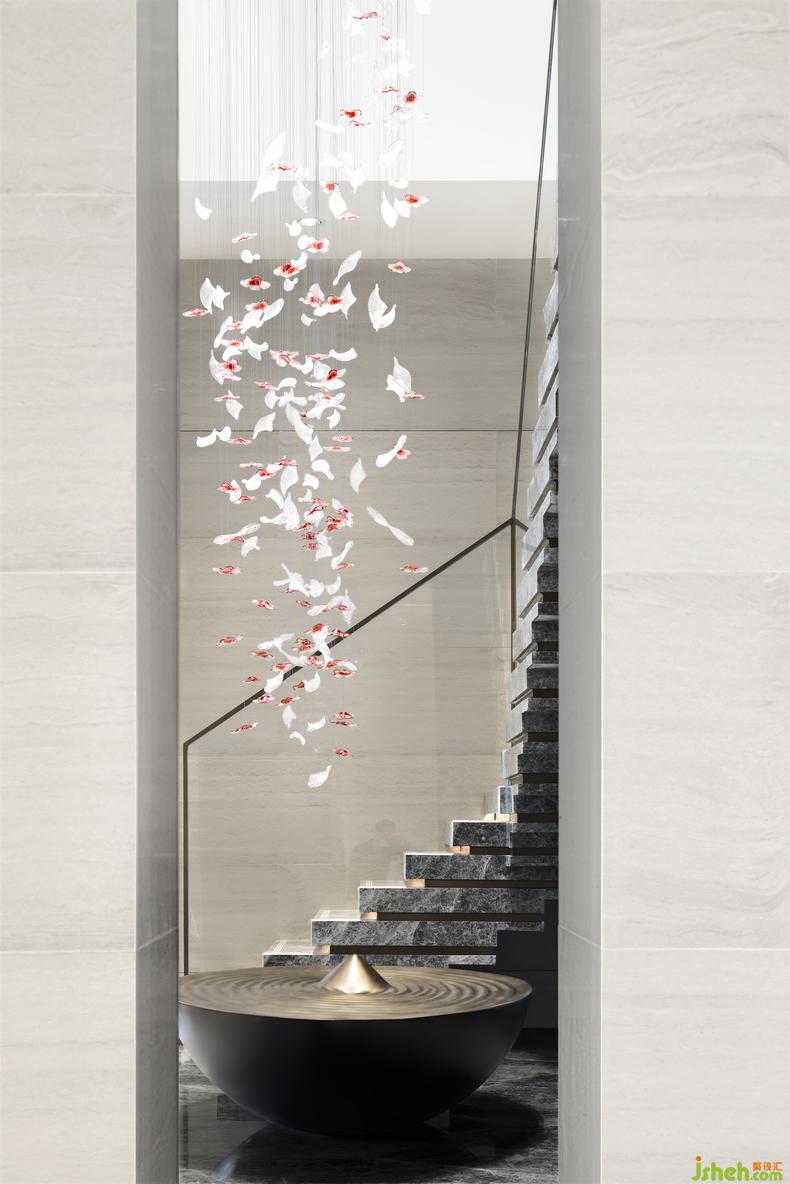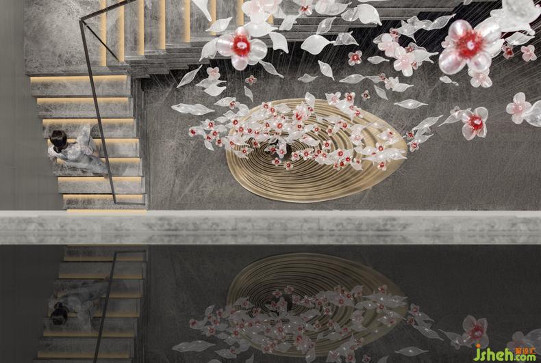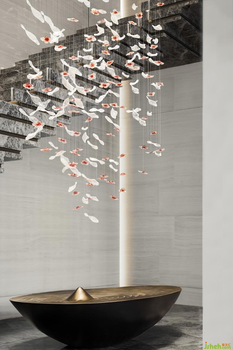 牡丹雕花墜飾和古銅金屬的水池裝置,凝聚著清雅朦朧的東方神韻。裝修設(shè)計(jì)雕花墜飾的透光工藝,使臨居深色水面上的牡丹看似更栩栩如生,吸引來(lái)往的人們對(duì)閑適自得的生活充滿(mǎn)遐想。