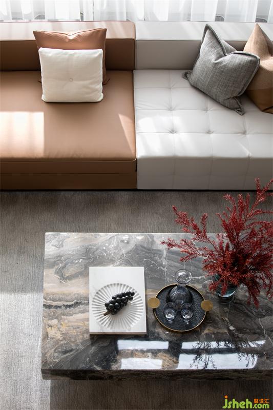 舒雅的高級灰調與咖色搭配,間或點綴的裝飾圖案及金屬線條元素拉伸出豐富的空間層次。躍然眼簾的客廳空間以一種高于生活的姿態(tài),由內而外散發(fā)出高級質感,表達著主人對極致優(yōu)雅的追求。
