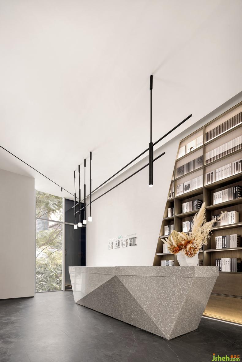 “納自然之形,建空間之意”,南寧的自然人文充分納入到設(shè)計之中。水磨石接待臺與上方的工業(yè)現(xiàn)代風(fēng)燈飾交相輝映,用線條鑄就力美表達。透過側(cè)面玻璃,望自由的綠植隨風(fēng)搖曳,自然和光影結(jié)于這一角,讓城市中的人們再一次放下心防,為這簡與雅的共同體留駐。