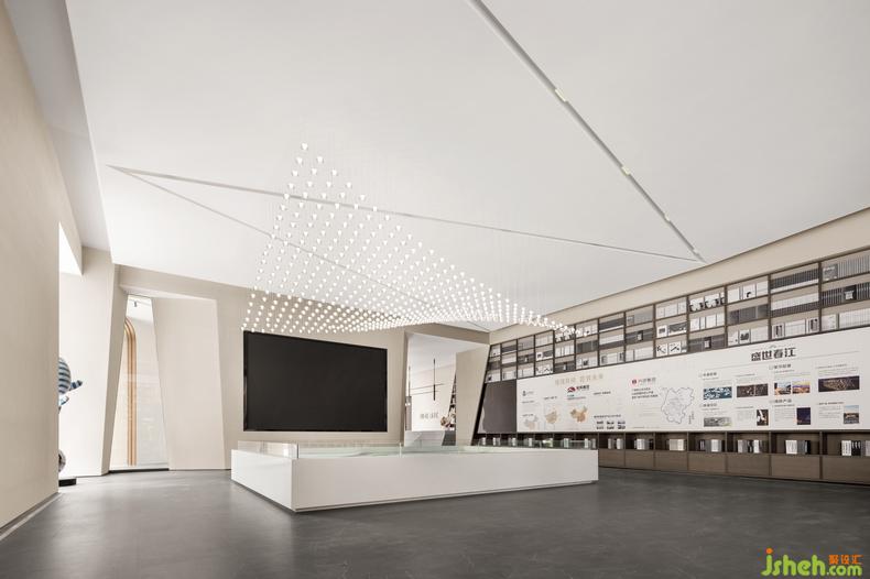 吊頂?shù)乃囆g(shù)裝置燈飾以“谷水潺潺,木落翩翩”的姿態(tài)呈現(xiàn),原木材質(zhì)的空間底色輔以流水的曲線(xiàn)造型,一動(dòng)一靜,于山谷悠揚(yáng),賦予空間“水到渠成”的寓意,為整體氛圍更添一份意蘊(yùn)。