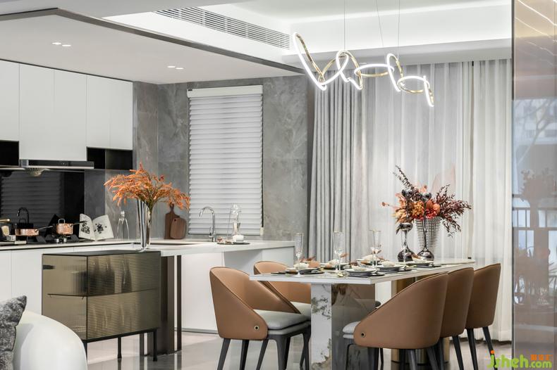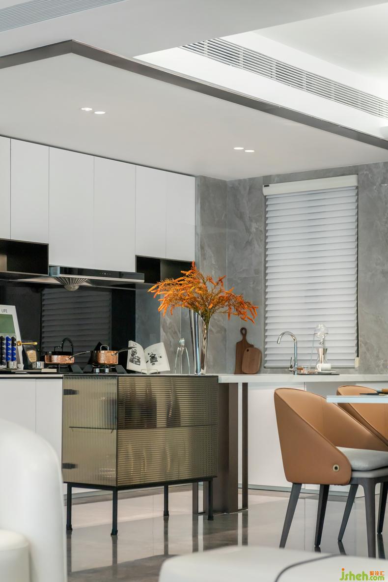 餐廳桌椅選用相同大地色系的輕奢皮椅,放置肌理感的柜子與其搭配,尚石設(shè)計(jì)歲月在優(yōu)雅間流淌。