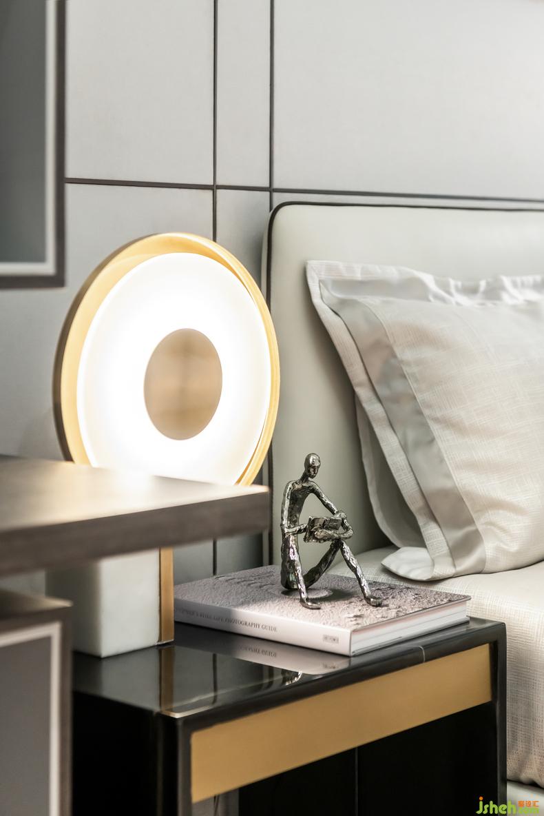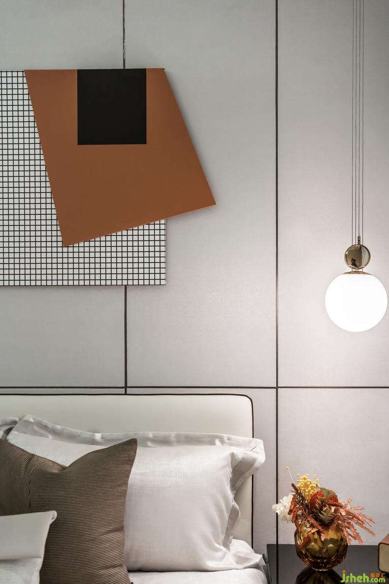 主臥床頭選用大理石裝飾和磨砂玻璃床頭燈,相比強(qiáng)烈的藝術(shù)感,更多是一種對(duì)藝術(shù)的沉淀表達(dá)。