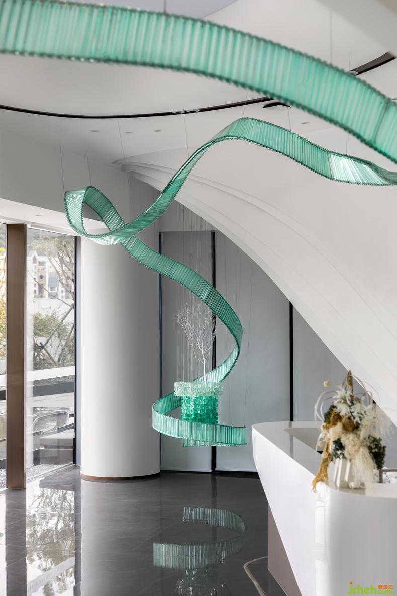 接待前廳是空間的第一印象,從天垂降的藝術(shù)天花裝置以輕盈的形態(tài),貫穿整個(gè)空間,與城市中蜿蜒飄然的柳江相呼應(yīng)。以水為脈,以樹為神,動(dòng)態(tài)回歸到靜物,一株枝葉紛繁的樹立于中心,小小一隅,囊括了自然的靜美與崢嶸。于一水一木中營(yíng)造“寄情于山水之間”的美好生活方式。