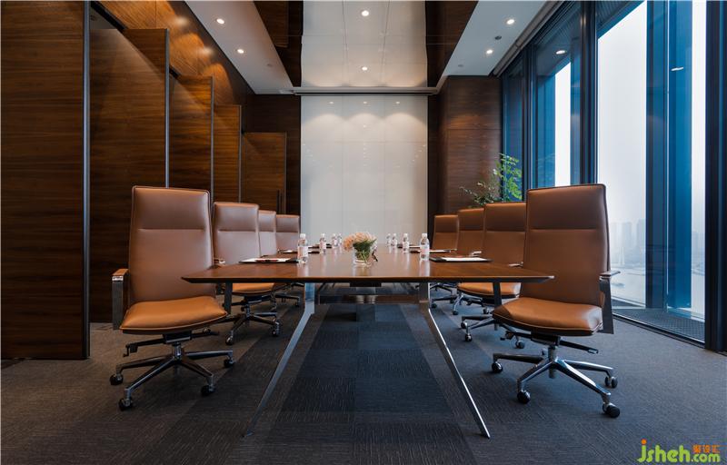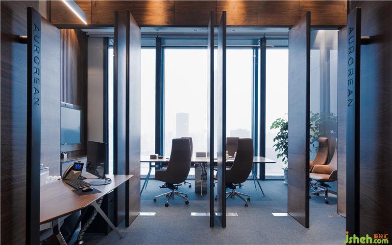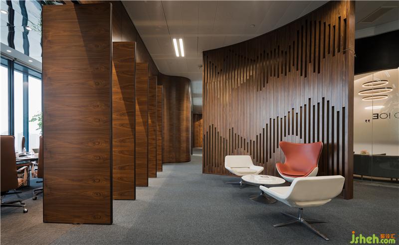 用胡桃木制作的隔斷沿著過道延伸,員工可以借由角度的轉(zhuǎn)換發(fā)現(xiàn)不同視野,進(jìn)一步加強(qiáng)了整個空間的連接和可視性。