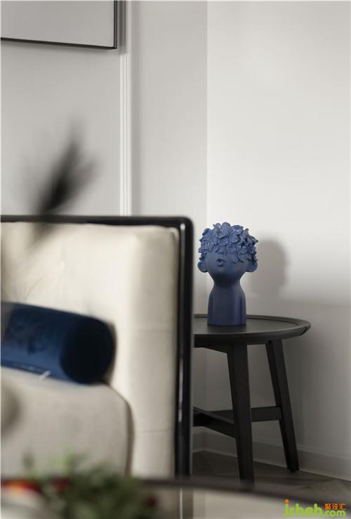 這是攝影師取了個(gè)近景,茶幾好物,黑色邊框茶幾上,擺放了兩個(gè)白色的陶瓷罐子,上面插了根羽毛,是既低調(diào)又愛俏。
