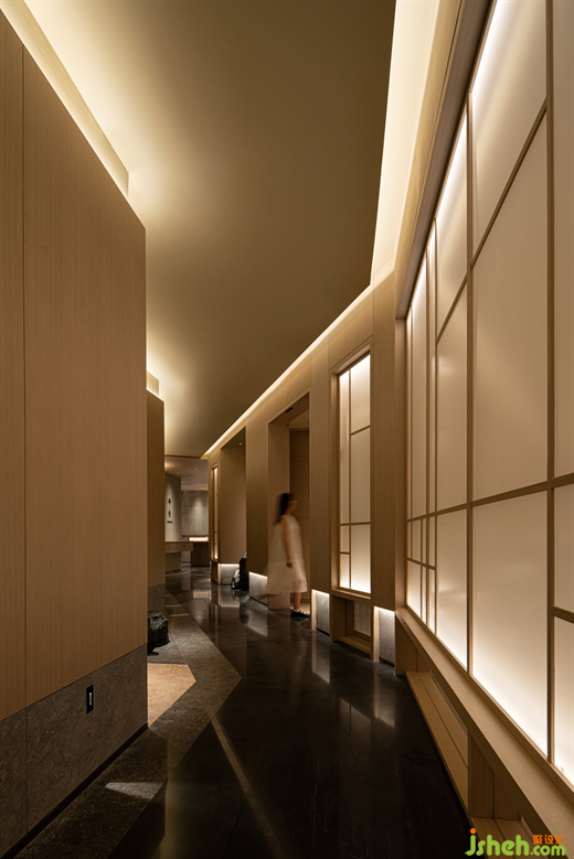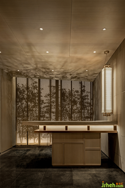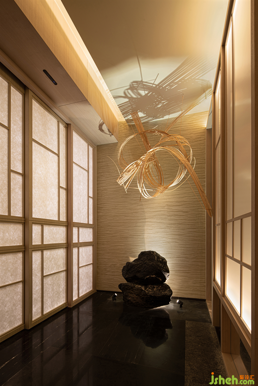 “櫻木”指代櫻花木,鱗次櫛比的田字格穹頂,日料餐廳設(shè)計(jì)微光初透的木障移門,是日本文化中平淡而深刻日常元素與生活注腳。