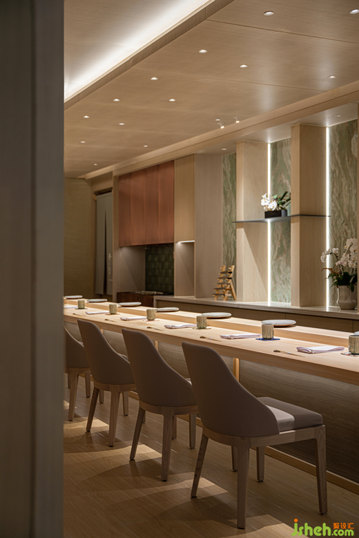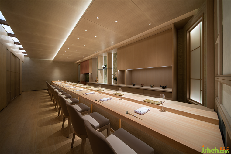 日料餐廳設(shè)計(jì)整個(gè)空間以木元素為主體,座區(qū)背后天花運(yùn)用的“青空燈”模擬自然光。