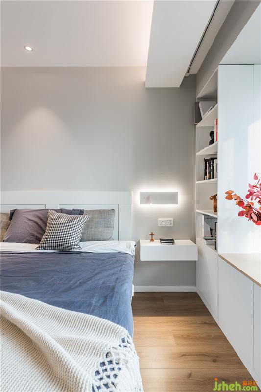 業(yè)主夫妻的日常作息時(shí)間不太一樣,女主人作息規(guī)律按時(shí)起床,但需要保證睡眠時(shí)不能收到聲音干擾,而男主人因?yàn)楣ぷ鞯脑虺3K煤芡?,這樣兩個(gè)人的晨起時(shí)間都是不一樣的。所以主臥有一些特別的設(shè)計(jì)——1.沒(méi)有設(shè)計(jì)衣柜而是把衣柜放在了靠近玄關(guān)的一個(gè)小臥室內(nèi),做成步入式衣帽間,女主人每天洗漱完就去衣帽間換試衣服,避免開(kāi)燈打擾到還在睡覺(jué)的丈夫。