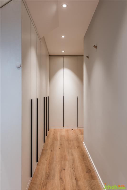 我們把原本靠近玄關(guān)的一個(gè)小房間改成了一個(gè)衣帽間+樓梯間,出門(mén)時(shí)直接來(lái)這里換好衣服整理儀容,動(dòng)線安排合理,女主人在使用時(shí)又能獨(dú)立于主臥不干擾到休息的男主人。利用墻面空間打造整面到頂?shù)牟饺胧揭旅遍g,實(shí)現(xiàn)了空間上的最大化利用。里面柜子放衣柜、鞋柜、箱子等一系列收納,造型好看功能強(qiáng)大,解決每個(gè)愛(ài)美的女士衣物收納需求。