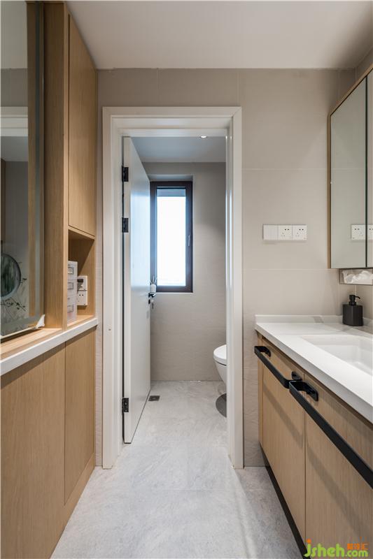 原始戶型兩個(gè)洗手間現(xiàn)在被改造成一間,分為兩部分位于主臥和次臥中間,其中一部分做了馬桶和洗漱臺(tái)分離設(shè)計(jì),洗漱臺(tái)對(duì)面還是收納柜,實(shí)用性很強(qiáng)。工作日的早晨,分離式設(shè)計(jì)使里面的人在如廁外面的人洗漱刷牙互不干擾,時(shí)間利用效率更高。