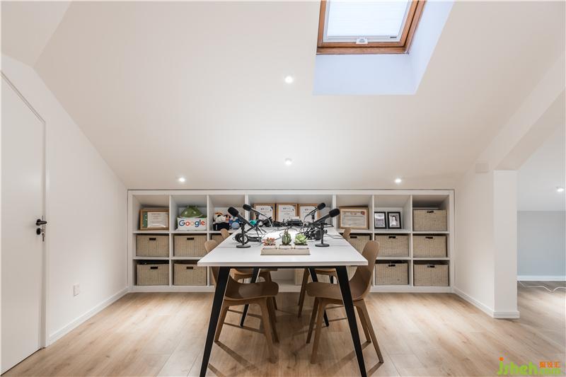 在設(shè)計(jì)辦公區(qū)時(shí)我們就考慮到業(yè)主的特殊職業(yè)需求做了辦公區(qū)的劃分,二樓右側(cè)作為一個(gè)可以容納四個(gè)人的錄音區(qū),利用閣樓邊角的特殊高度,定制了特殊尺寸的收納柜完成這個(gè)區(qū)域的收納。閣樓的無(wú)主燈設(shè)計(jì)充分滿足了明亮的燈光需求,主要辦公區(qū)域的射燈都是色溫一致,沒(méi)有明暗對(duì)比空間感覺(jué)十分明亮舒適。