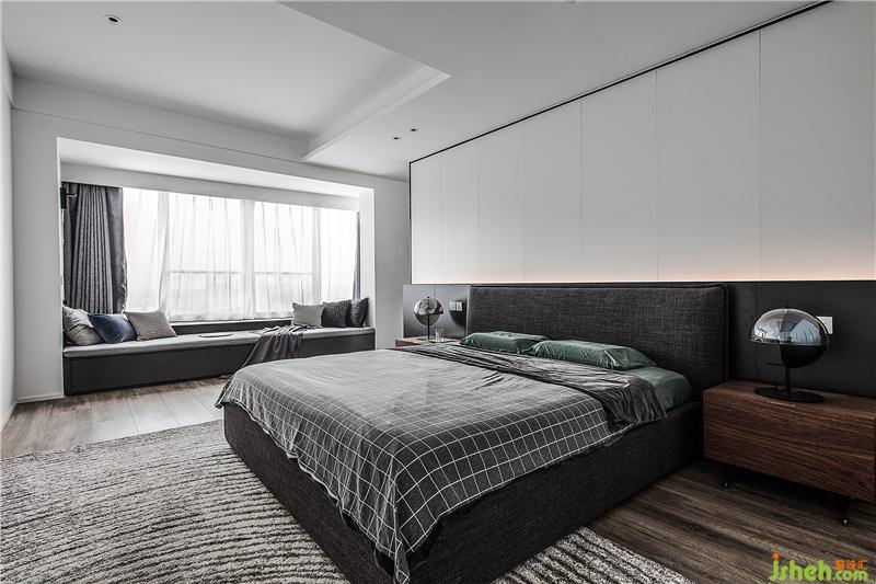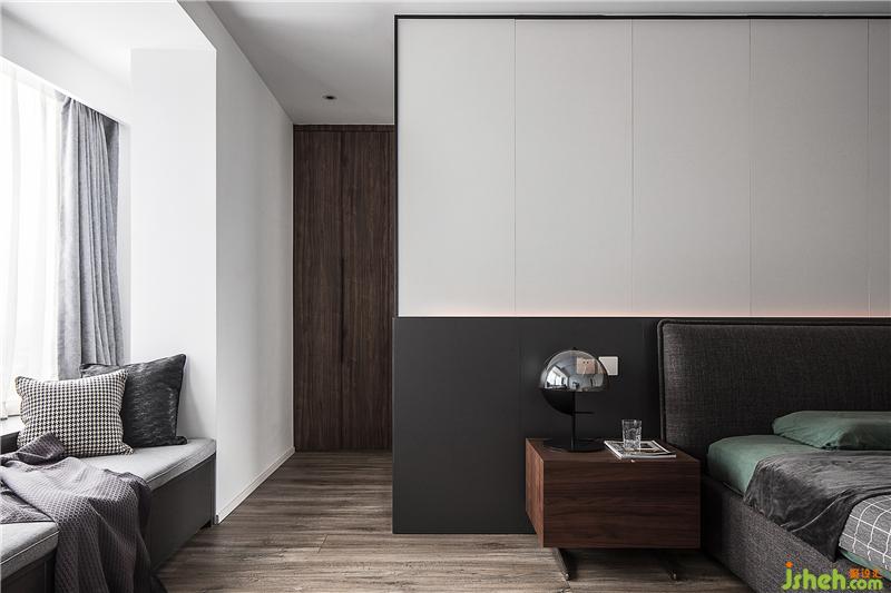 主臥的飄窗是改造后的陽臺,納入室內(nèi)后整個(gè)空間十分寬敞,主臥背景墻是采用定制墻板,純白的部分結(jié)合隱藏?zé)魩?,顯得十分有層次,深色系的床品和地毯結(jié)合白色的頂面框架,帶來視覺上的和諧美感。這里的主臥并不是封閉的一覽無余的,背景墻左邊是留出了一個(gè)進(jìn)入衣帽間和主衛(wèi)的門。在不經(jīng)意處,暗藏玄機(jī)。