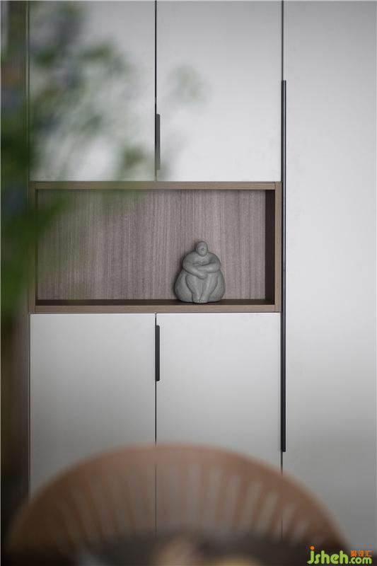入戶無(wú)玄關(guān)的情況下,巧構(gòu)兩面嵌入式的儲(chǔ)物柜,與墻和諧的融為一體,沉淀的木色給與進(jìn)來(lái)的人一股安靜的主調(diào),這個(gè)空間流轉(zhuǎn)內(nèi)斂、安靜訴說(shuō)的舊時(shí)光。