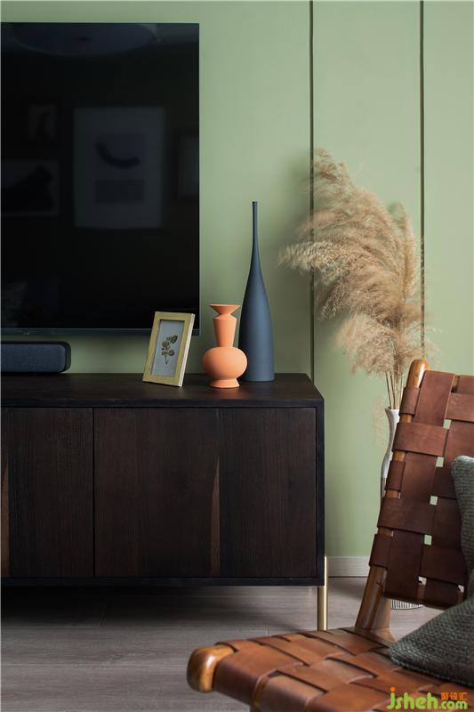 電視背景墻采用大面積的復(fù)古綠同時(shí),也用規(guī)律的豎形線條帶來獨(dú)特的處理。這個(gè)角落,造型優(yōu)美的器皿,活潑的跳色,瞬間點(diǎn)亮整個(gè)空間。