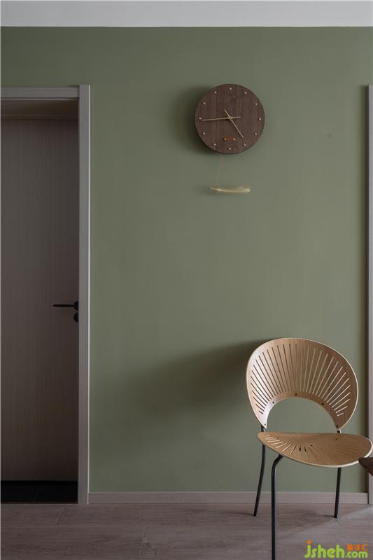 餐廳對面的走廊墻面,沒有過多的元素,一鐘一椅,達(dá)到盡量的簡約與減壓。