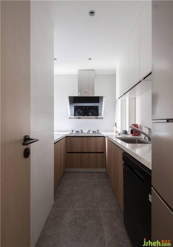 原始戶型狹長采光不好的廚房,經(jīng)過巧手改造變身”U型“廚房操作布局。