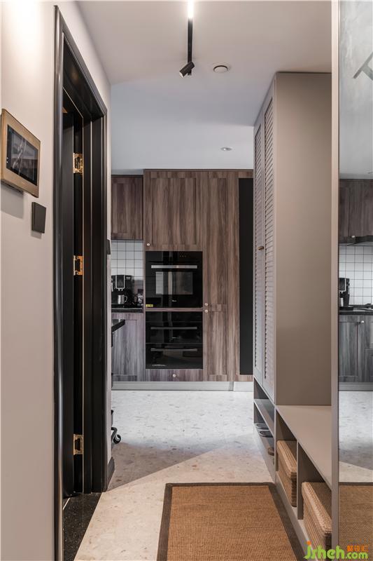 原始入戶是一條狹長(zhǎng)的通道,左邊是樓梯,右邊是洗手間,無玄關(guān)的情況下,視覺上和使用都非常局促,設(shè)計(jì)師將洗手間原始干區(qū)取消,改造成為一個(gè)雙面使用的玄關(guān)隔斷,正面衣柜-鞋柜-座凳三者結(jié)合,完全滿足進(jìn)門換鞋收衣服的需求,還有一面玄關(guān)鏡,整理儀容,非常好用。