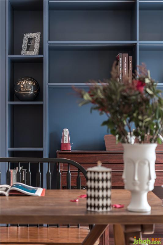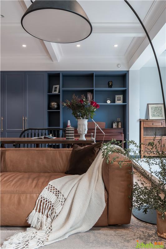 屋主M喜歡復古、輕松的氛圍,一樓空間主色調(diào)通過深棕皮質(zhì)沙發(fā)+復古藍柜面,天津別墅設(shè)計搭配造型復古的精致擺件,深色的木質(zhì)帶來懷舊的氣質(zhì)。屋主一家人在家的時間比較多,希望家可以很溫暖,充滿包容,同時又可以時換時新,不然沒住多久就看膩了。