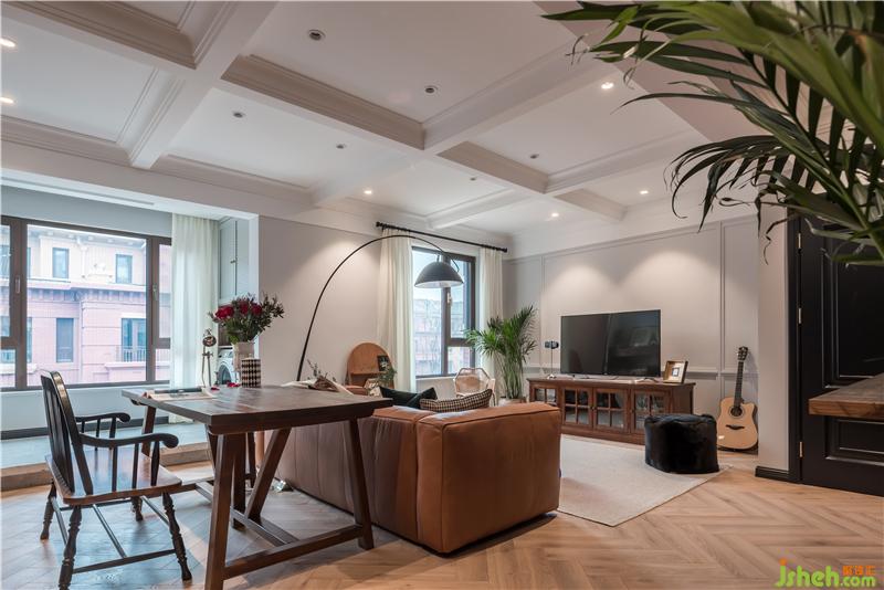 站在書房的角度看客廳,人字拼地板與深灰色的搭配,空間主色調(diào)十分柔和,復古又精致。
