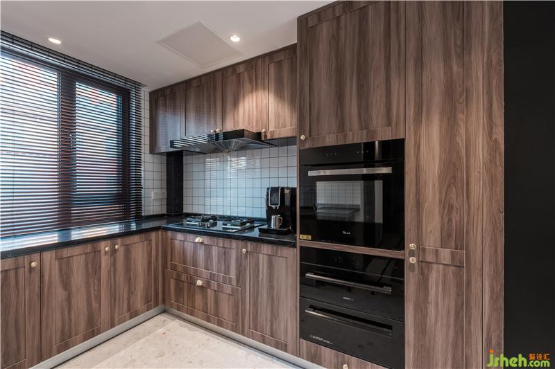 櫥柜的紋理特別選用了這種木質(zhì)紋理,深色紋理搭配純黑臺面,顯得十分高級,搭配清新的小白磚和水磨石地面,廚房顏色有主有次。純黑百葉簾的選擇為空間帶來了協(xié)調(diào)一致的美感。