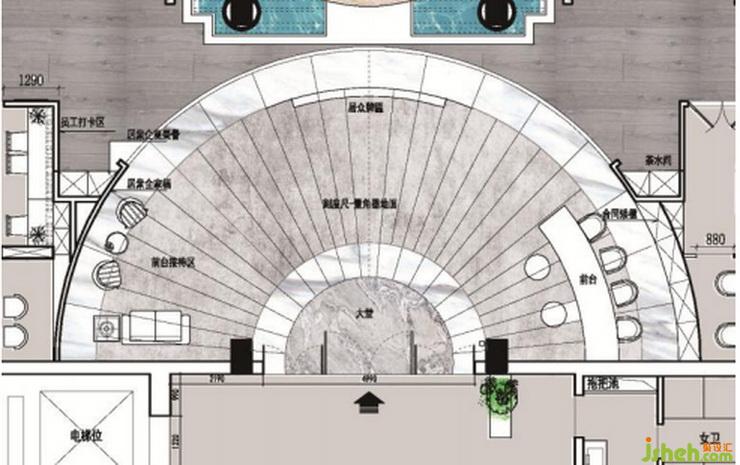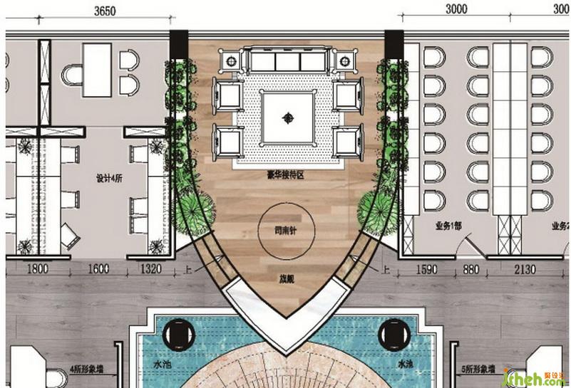 在我們平面構(gòu)思中,以坐南朝北,八卦里的坎位來(lái)做大門,因?yàn)楸狈娇参粚偎嫦虮杯h(huán)大道車水馬龍,自然也就水到渠成了。當(dāng)我們的客戶從北面帶水進(jìn)入大門時(shí),應(yīng)立即進(jìn)入我們的第二空間的中心部位,風(fēng)水寶地(易經(jīng)閣),地面圖形設(shè)計(jì)用的風(fēng)水羅盤,也稱水中金,當(dāng)一滴水融入大海之后,才是相生相吸,才能洶涌澎湃。在水池中間的羅盤上我們描金線來(lái)聯(lián)系,在這個(gè)互聯(lián)網(wǎng)時(shí)代的趨勢(shì)下,也代表著通往各處的人脈關(guān)系網(wǎng)。我們大家通過(guò)不斷的溝通和交流,使人氣凝聚在一起,才有源源不斷的生命力,讓整個(gè)空間蓬壁生輝。