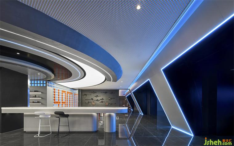 斜面的大型盒子如裝置一樣座立在空間上,電競俱樂部設(shè)計(jì)靛藍(lán)色的極光穿梭在空間之中,就像生活在未來的賽博朋克世界。