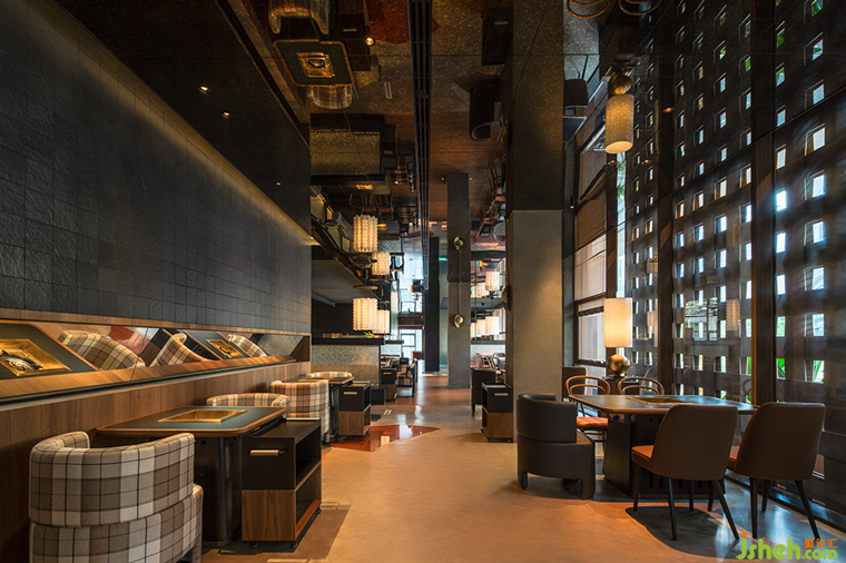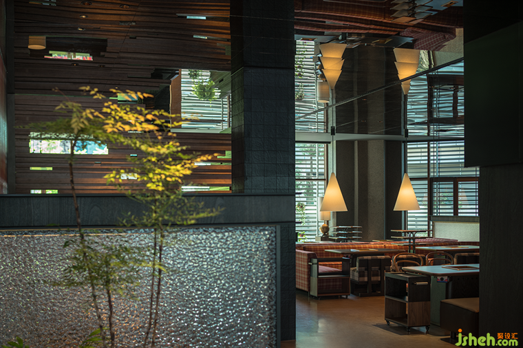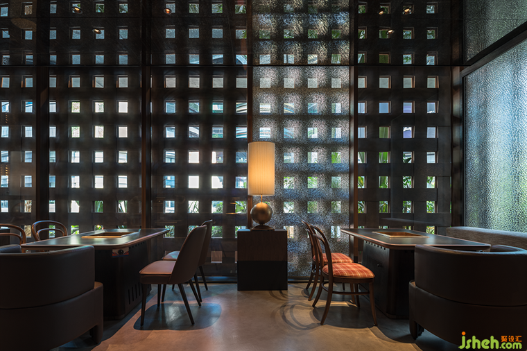 空間層次上的高低處理、多種透與不透、隔斷介質(zhì)的穿插, 火鍋店設(shè)計超常規(guī)尺度編制隔斷,仿佛捕夢網(wǎng),與紅色異形石材地拼、充滿肌理感堆積木料、秩序感陣列吊燈形成獨(dú)特的空間語言體系。類似電影的跳接剪輯、蒙太奇手法,這些手法的運(yùn)用讓空間帶有些許電影氣質(zhì),如夢如囈語的電影旁白般貫穿始終,滲透著設(shè)計師對“夢”的理解。