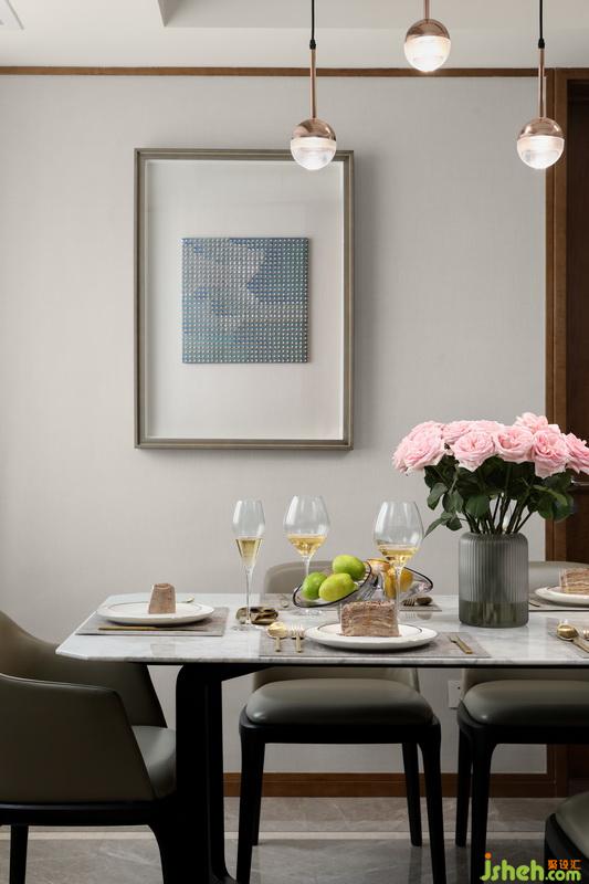 餐廳水晶燈選用了玫瑰金色,高低錯落,一字排開,抽象的立體畫,精致而不失格調(diào),荔枝玫瑰的芬芳淡淡彌漫在空氣中,三兩好友,家人小聚,美好不過如此…