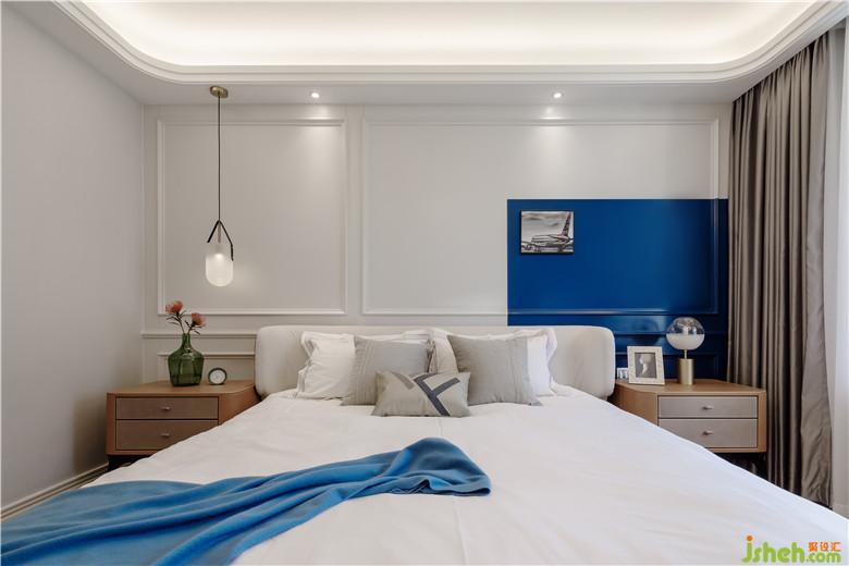 主臥背景,由簡單的線條方框而構成,只需把握好比例,加入不一樣的藍色基調,便能起到畫龍點睛的作用。原皮家具釋放出低調的溫暖,浸潤著這個空間…