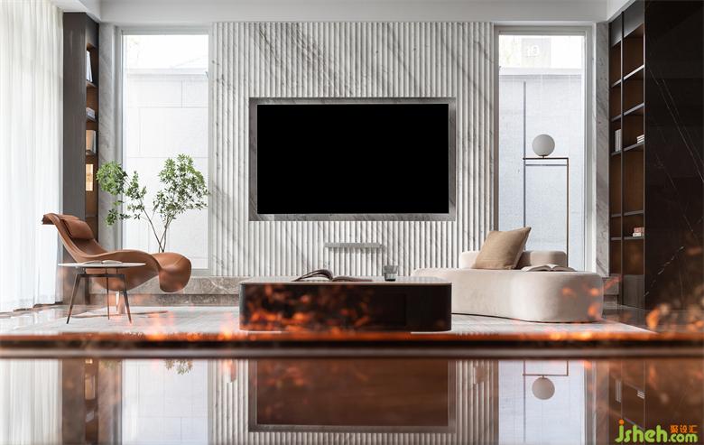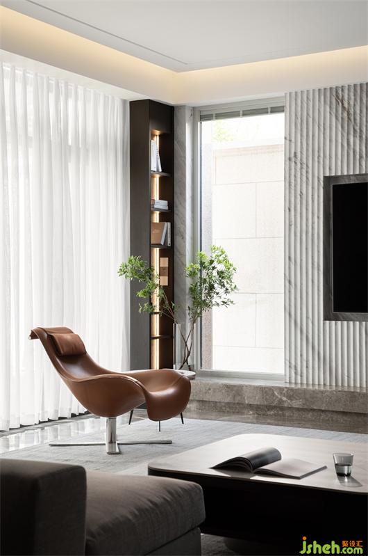 別墅裝飾設(shè)計(jì)師重置結(jié)構(gòu),于電視背景墻兩側(cè)最大程度引入自然光,令空間視覺通透流暢,功能布局更為完善,閑適生活,時(shí)時(shí)明亮。