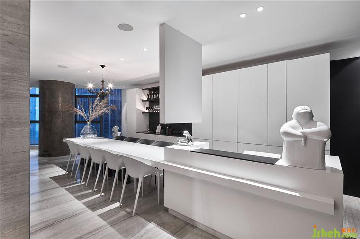 前臺是一直延伸至餐桌的大體塊,中間的隔板將兩個區(qū)域巧妙劃分,將空間的完整性、功能性發(fā)揮到極致。臺面上配以充滿趣味性的藝術品,理性與感性在此展現(xiàn),讓辦公空間有序又不單調(diào)。