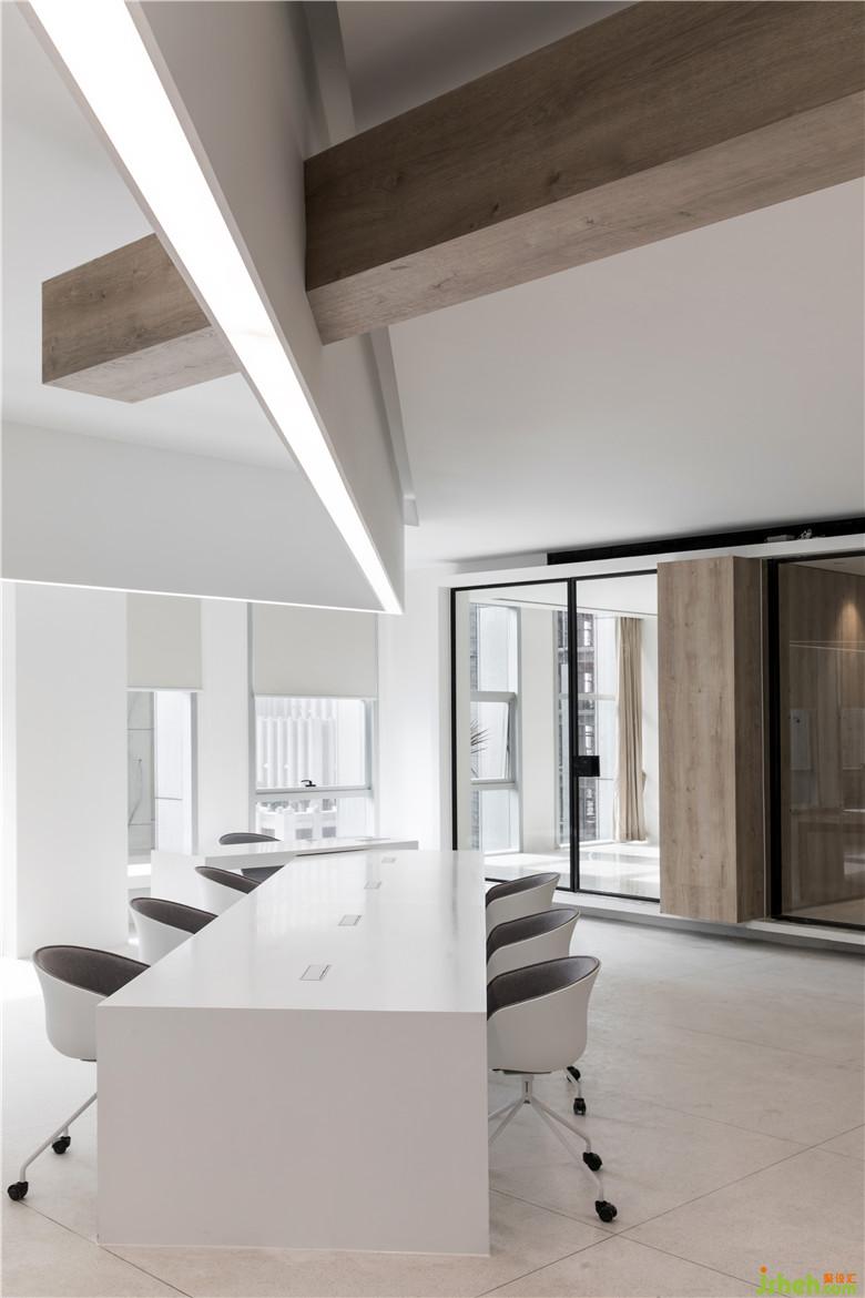 員工辦公區(qū)大面積采用了白色,線型的暖光燈為空間加強了結(jié)構(gòu)性,顯得更加自由。辦公桌沿著頂部燈的走向分布,呈現(xiàn)出有秩序的美感。