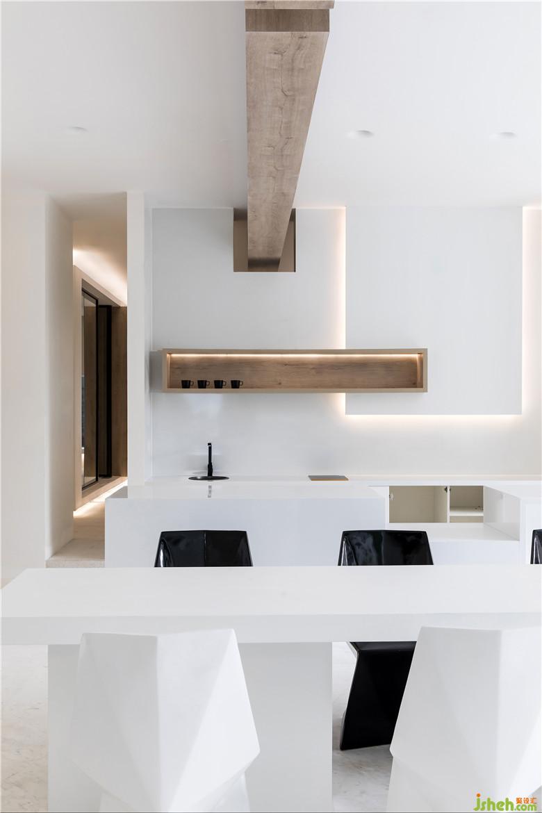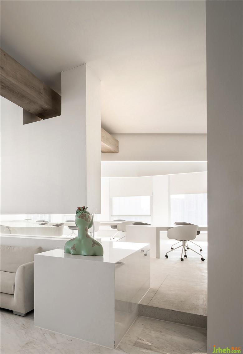 會(huì)議室門口的“大盒子”體塊中嵌入通透的玻璃體塊,讓空間顯得更加柔和與有趣。
