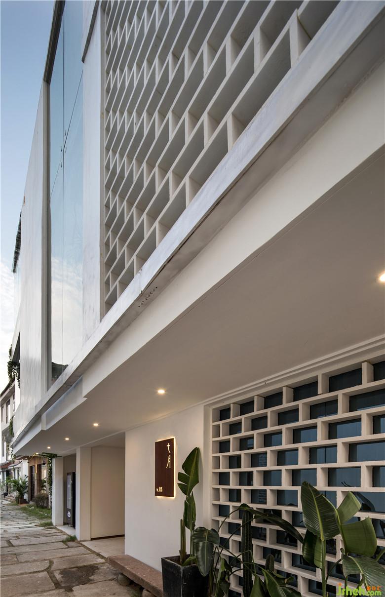 「駐·85」的建筑通體呈白色,結(jié)合江南傳統(tǒng)的“白墻黑瓦”的傳統(tǒng)進行創(chuàng)新,融合在當?shù)亟ㄖ褐?。設(shè)計師用一個個“木方塊”堆疊,讓建筑外立面變得擁有構(gòu)成感,并且做了層層內(nèi)退的處理,使用了木飾面與通透的玻璃材料為原本封閉的空間劃出了陽臺,為空間擴大了視野、加強層次感。