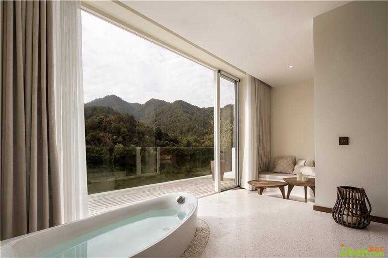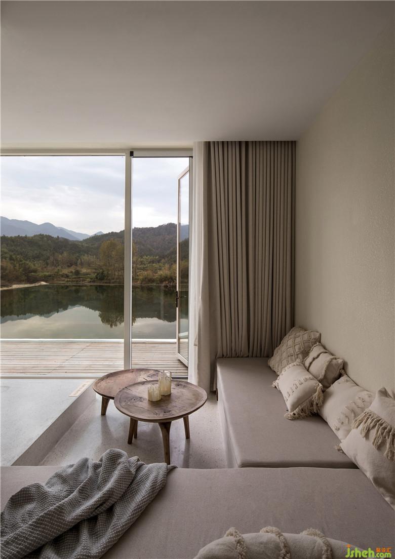 材質(zhì)上選用了暖色的涂料與木質(zhì)搭配,讓空間呈現(xiàn)出溫暖自然的格調(diào)。身處的空間變得純粹、寧靜,能夠讓人瞬間忘掉一切煩惱,盡情欣賞眼前的好山好水。