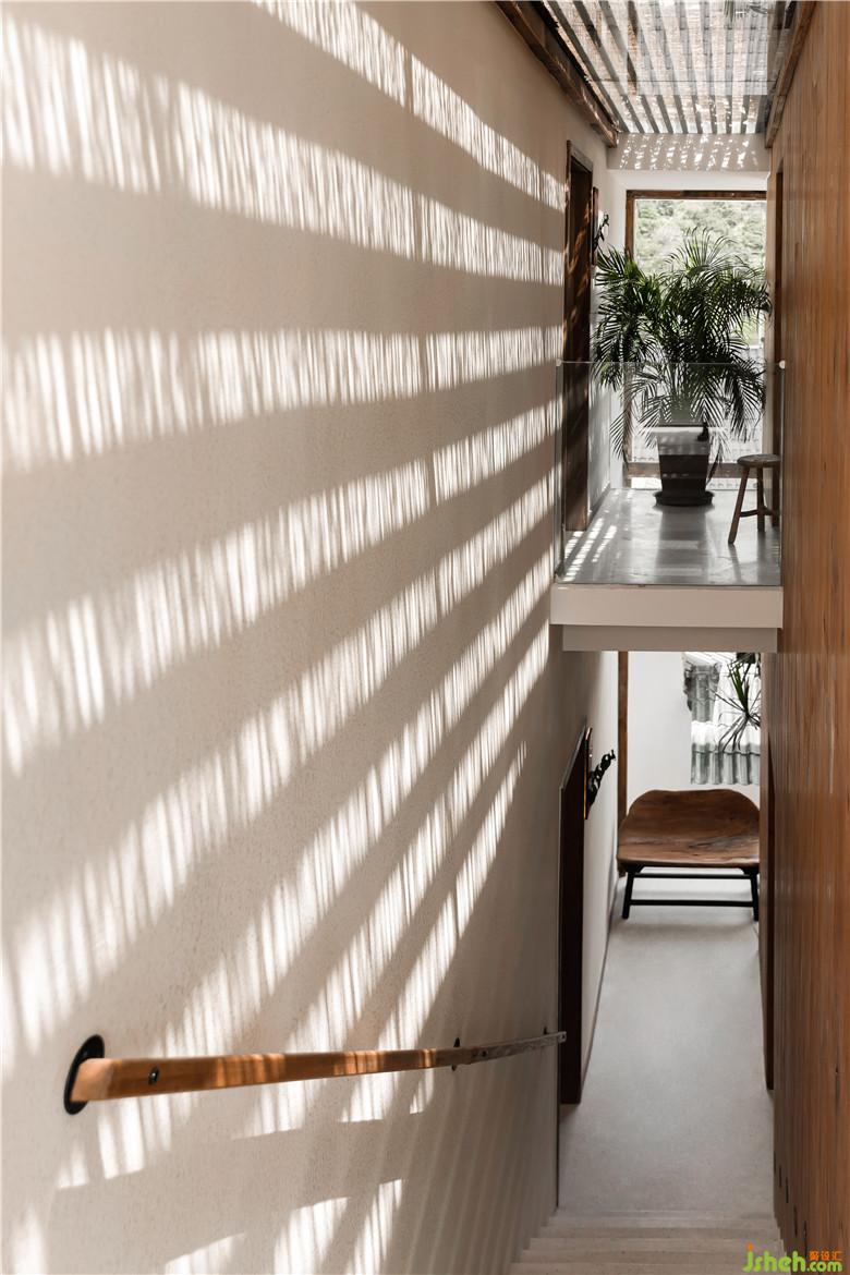 樓梯間的設(shè)計(jì)也極具巧思,頂部開出一個(gè)玻璃天窗,蓋以草簾遮陽,陽光穿過間隙映射出移動(dòng)的光影,仿佛擁有生命力,為空間增加了溫度與感動(dòng)。拾級而上,透過大落地玻璃慢慢顯露出遠(yuǎn)處的山水,時(shí)不時(shí)可以看到人們在優(yōu)哉游哉地泛著竹筏的場景,仿佛還原了古時(shí)漁民生活的熱鬧場景。