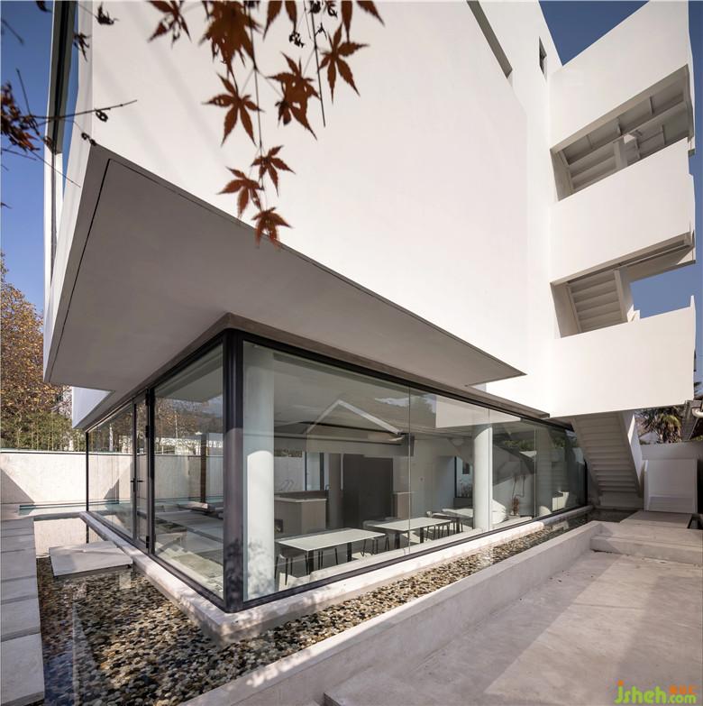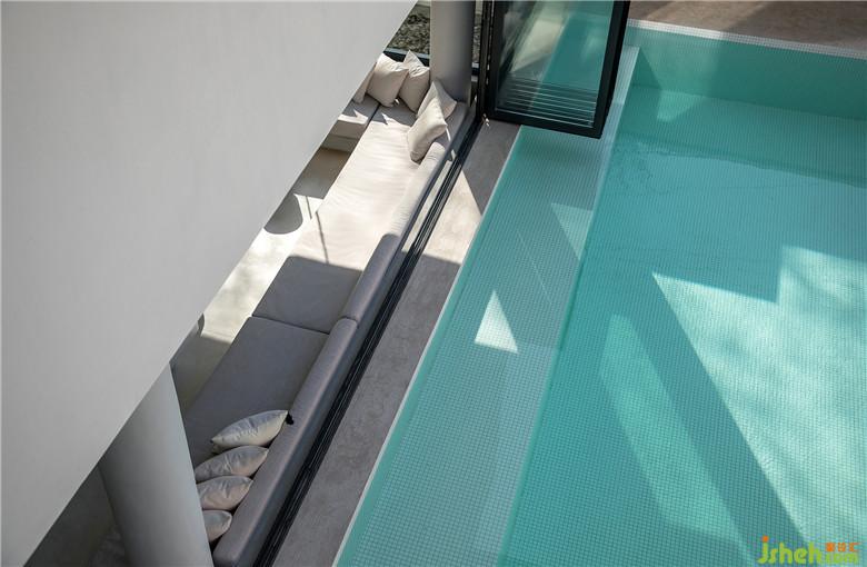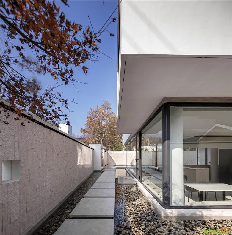 整個(gè)庭院被水系包圍,建筑就像是懸浮在水面中,從泳池到汀步走道以及圍墻中不斷流動的瀑布,互相流通循環(huán),設(shè)計(jì)師希望建筑能在水中無限生長,賦予生命與自然的力量。