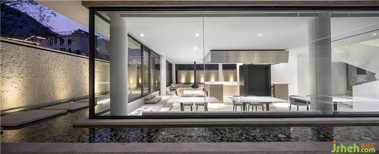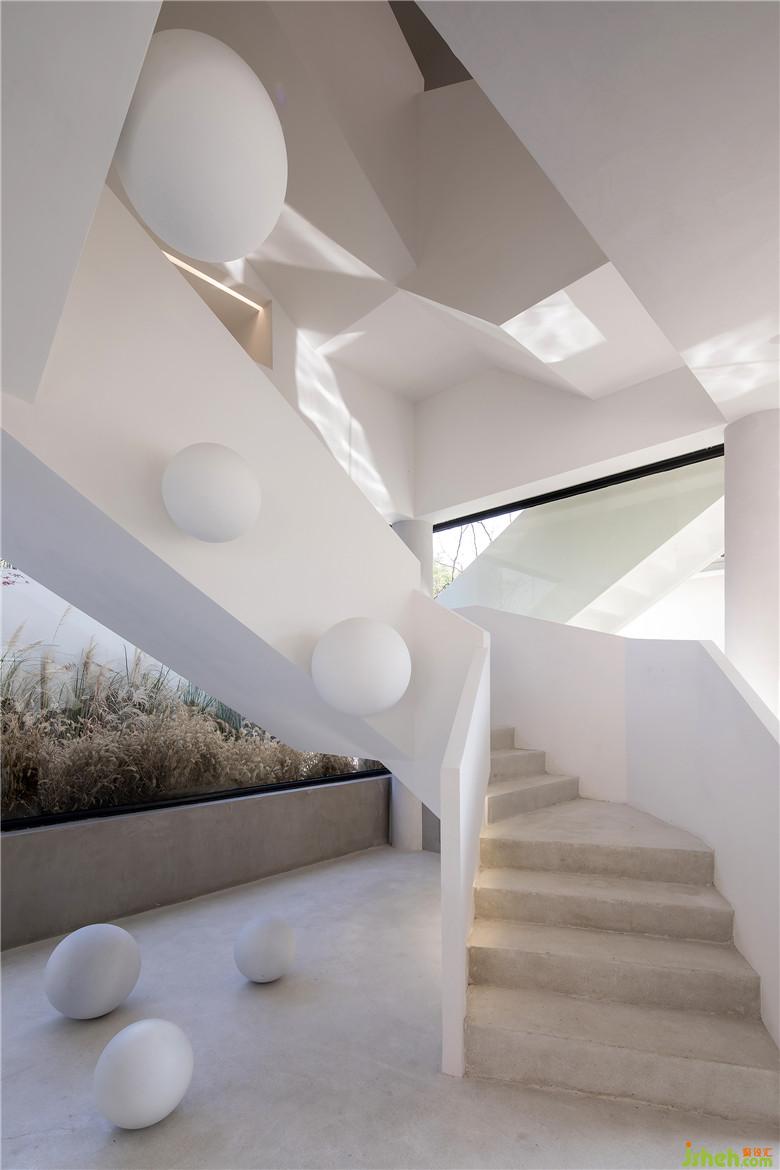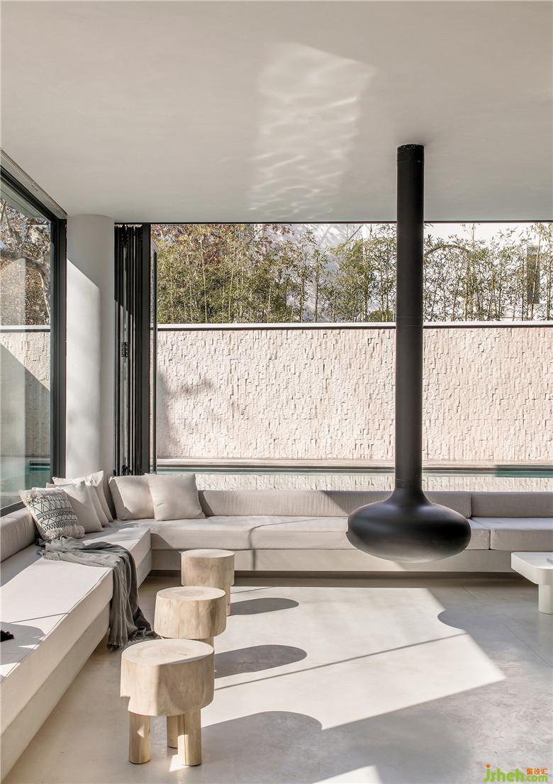 步入室內(nèi),將一層公共空間做了下沉處理,底層架空,通過柱子進(jìn)行支撐讓墻體解放,猶如一根根樹干,空間瞬間變得通透、寬敞,四周大開窗的玻璃設(shè)計(jì)將景色引入室內(nèi),以景喻情,充滿了自然斑斕的色彩。