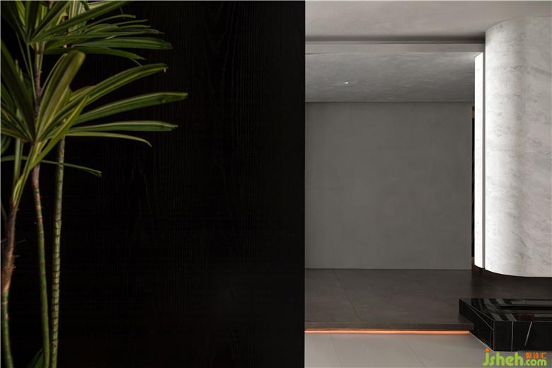 Use a modeling wall with storage function and fireplace function to distinguish the corridor and the dining area. The circular element on the top surface symbolizes the sky and the universe, echoes the ground, and integrates nature and space.