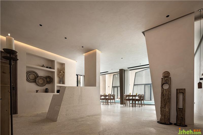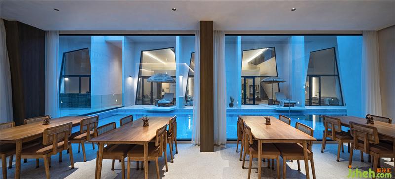 公共區(qū)域與餐廳進(jìn)行結(jié)合,透過落地玻璃可以看到星空泳池的全景。