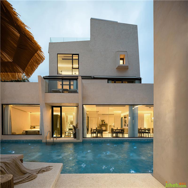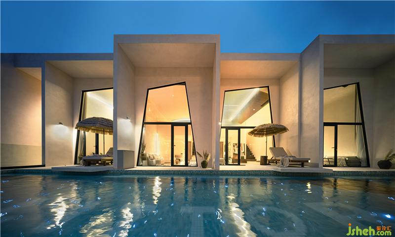 設(shè)計(jì)師希望客人可以從房間中直接躍入水中,時(shí)刻能與大海進(jìn)行互動(dòng)。因此在兩幢客房間建造了一個(gè)星空泳池,呼應(yīng)了“海天一色”的概念。